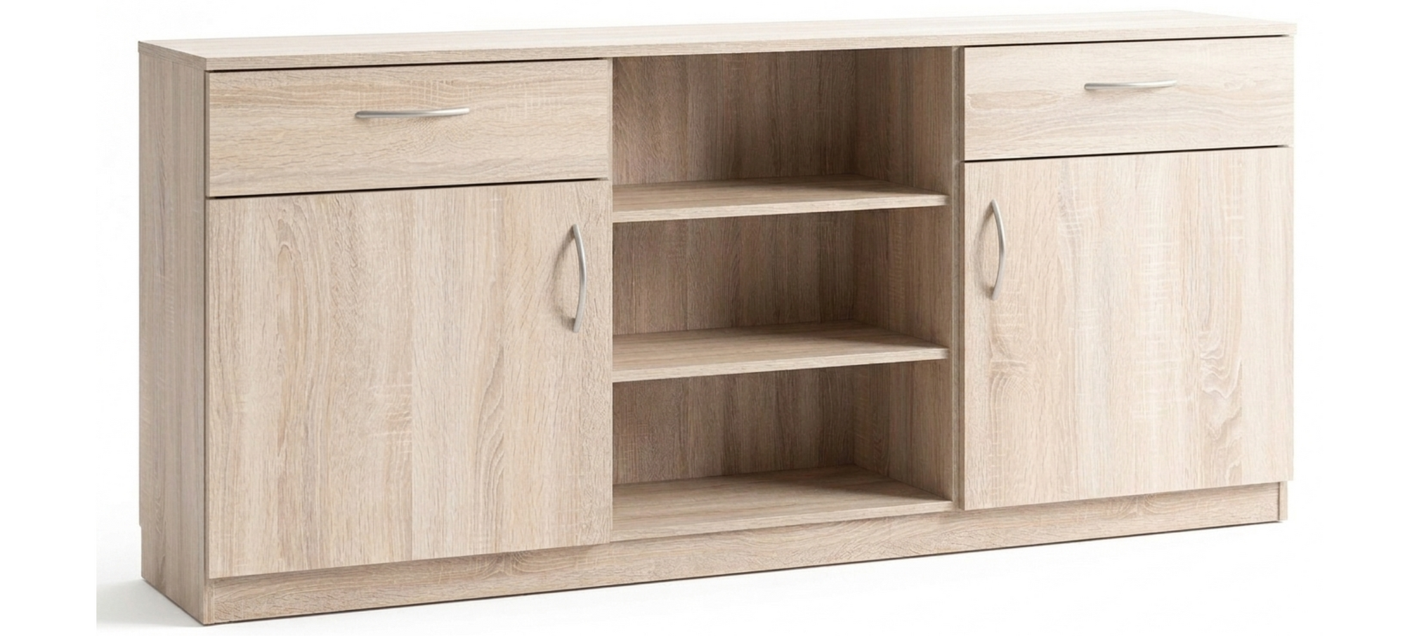 Mitte offen, 2 Einlegeböden, rechts und links ein Schubkasten und eine Flügeltür, dahinter ein Einlegeboden